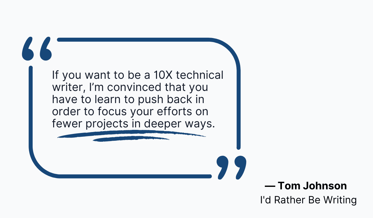 According to the technical writing expert Tom Johnson, you have to learn how to say “no” not only to yourself but also to clients, product owners, and managers who ask for too much.