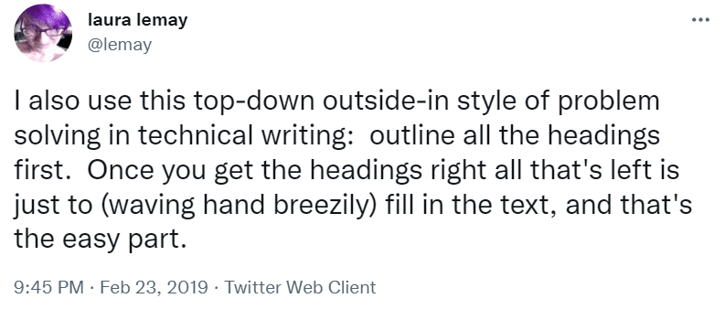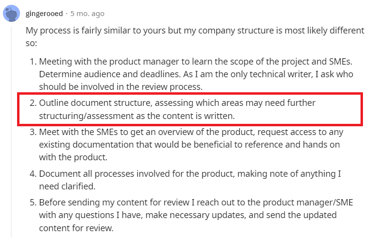 This Reddit thread where tech writers share their work processes reveals that most authors tweak their outlines as they create tech content.