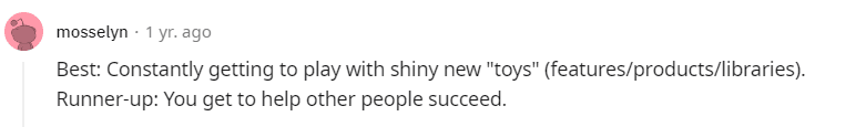 In fact, the rewarding feeling you get when your docs help somebody solve a problem was among the most frequently cited pros in an online discussion about best and worst elements of being a tech writer.