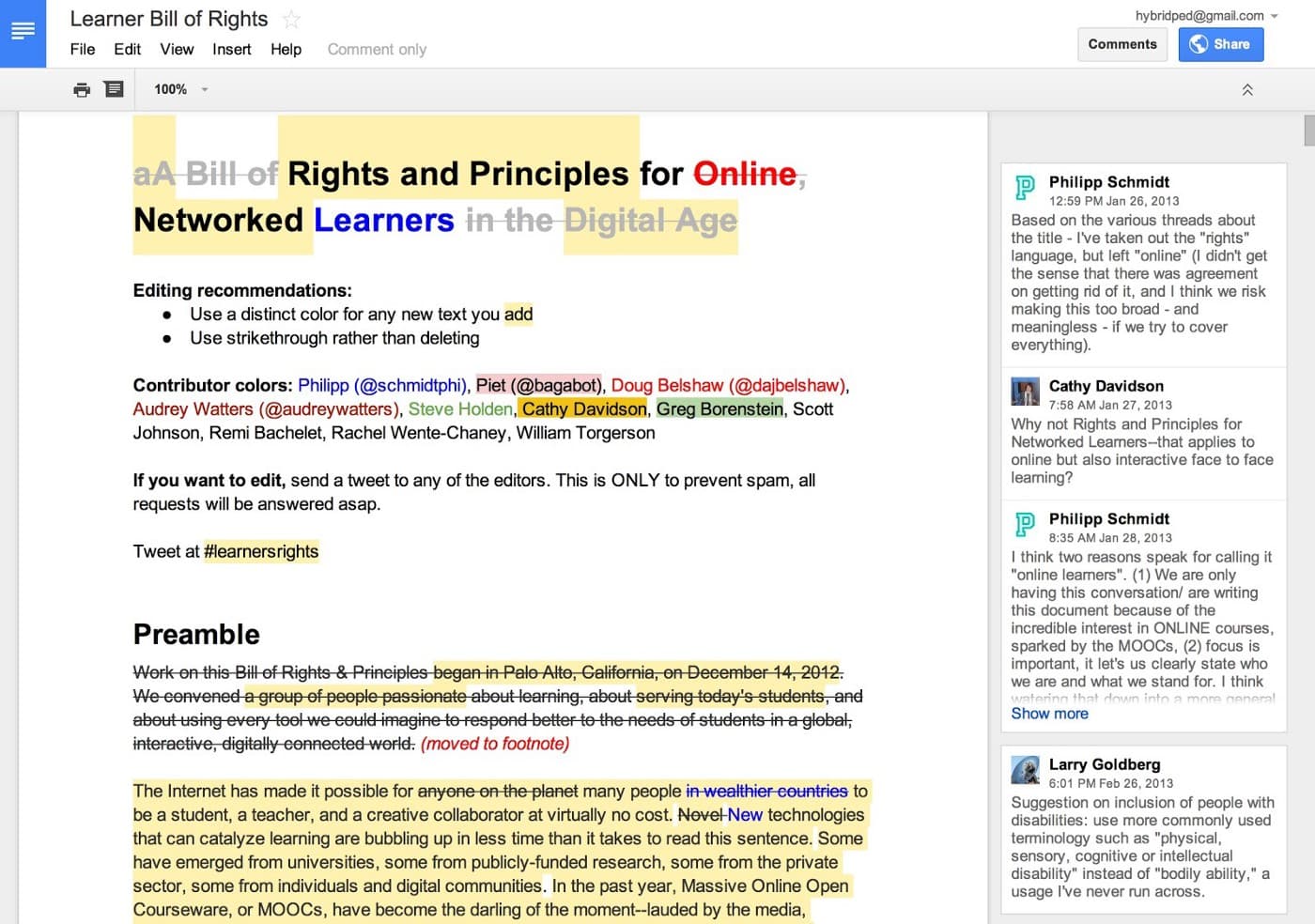 In Google Docs, multiple people can access the same document, edit it, comment on it and see every change as it happens.