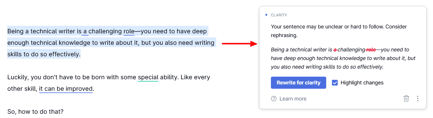 For instance, in the example below, the tool suggested we rewrite a sentence for more clarity.