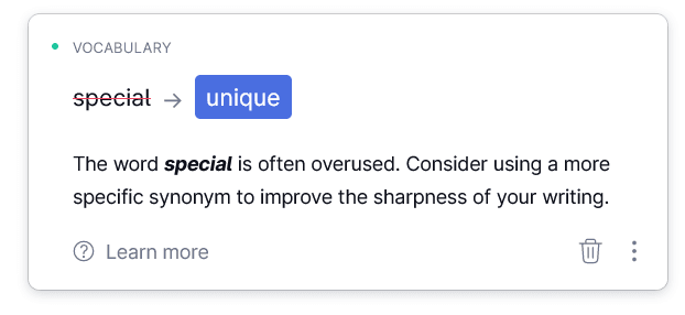 Also, vocabulary suggestions can be useful for technical writers as they encourage variety in writing and offer synonyms for the words you might be repeating too often.