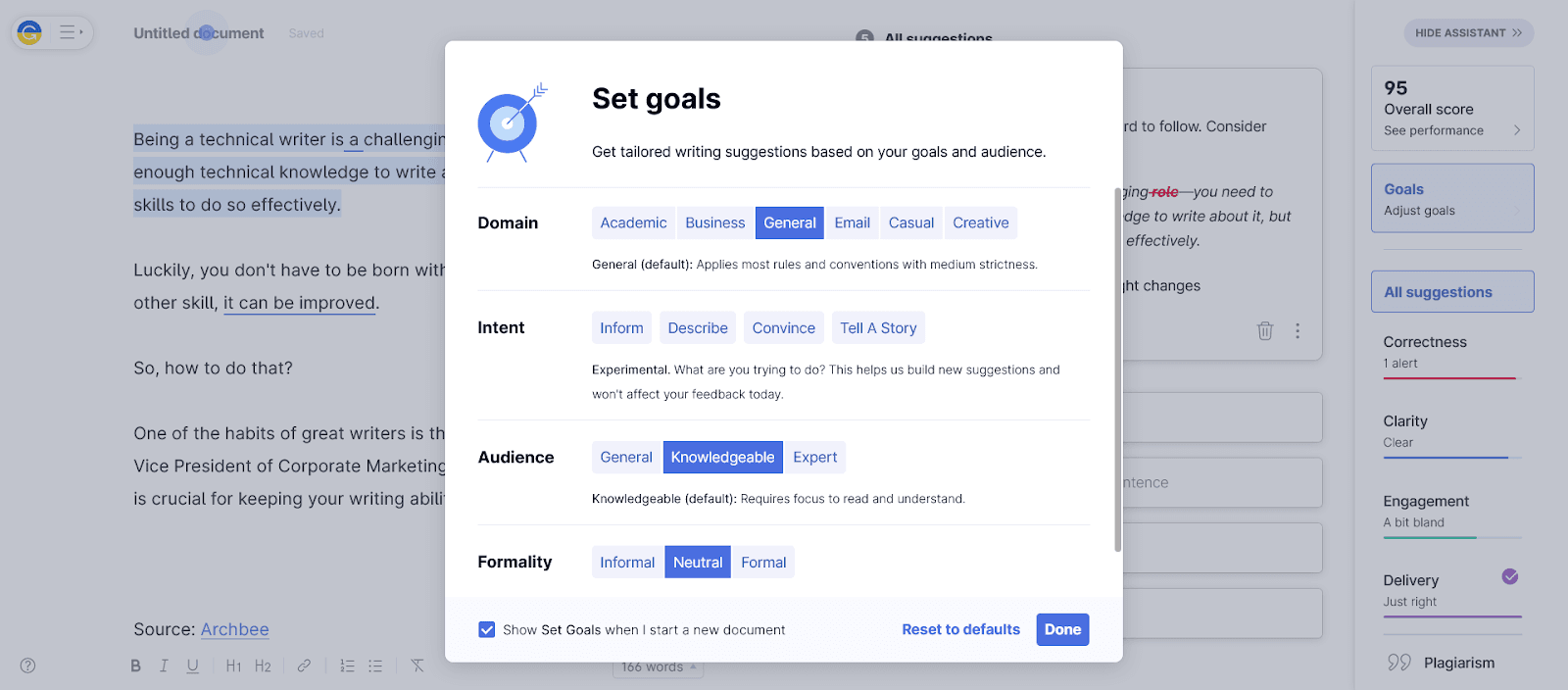 You can also adjust the suggestions it gives you by setting parameters like domain, intent, the audience you write for, and the level of formality of the text.