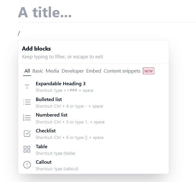 For example, you can choose a checklist block, and Archbee will insert a checklist ready for you to fill in.