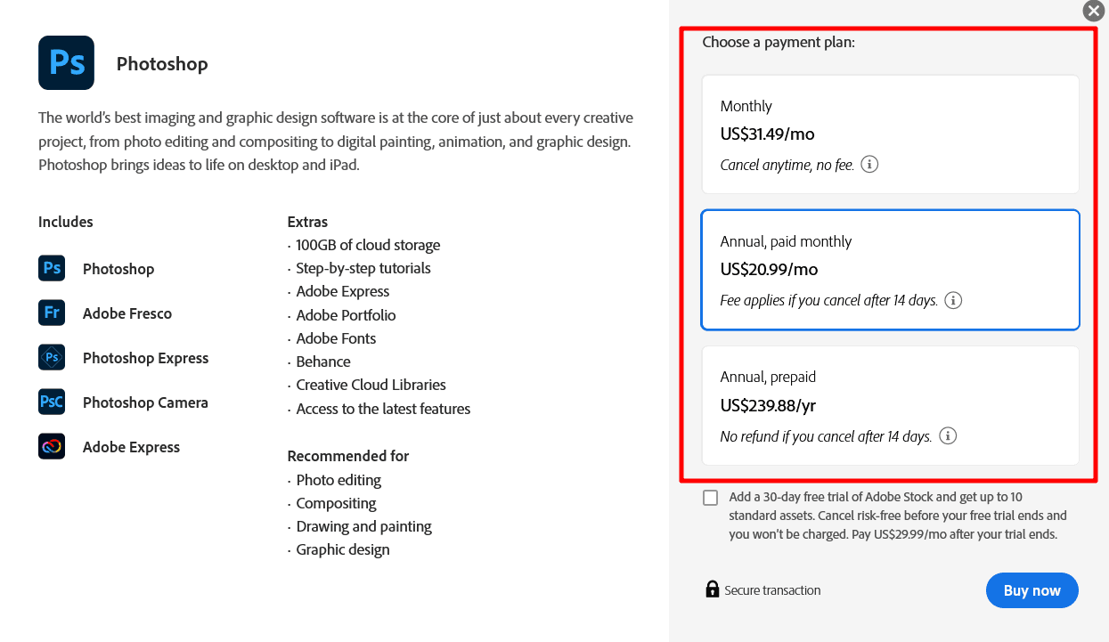 Adobe Photoshop is available for $20,99 a month if you pay annually, which includes a 14-day free trial.