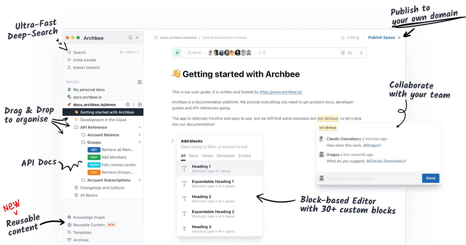 Writers can use Archbee for every step of creating a technical document, from writing the text and enriching it with visuals to organizing it into categories and collaborating with the rest of the team.