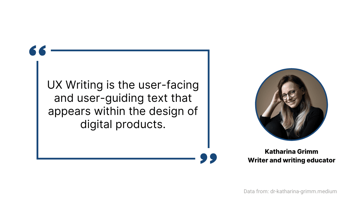 According to Katharina Grimm, a writer and writing educator, UX writing is a type of writing that is strictly aimed at users and improving their experience.