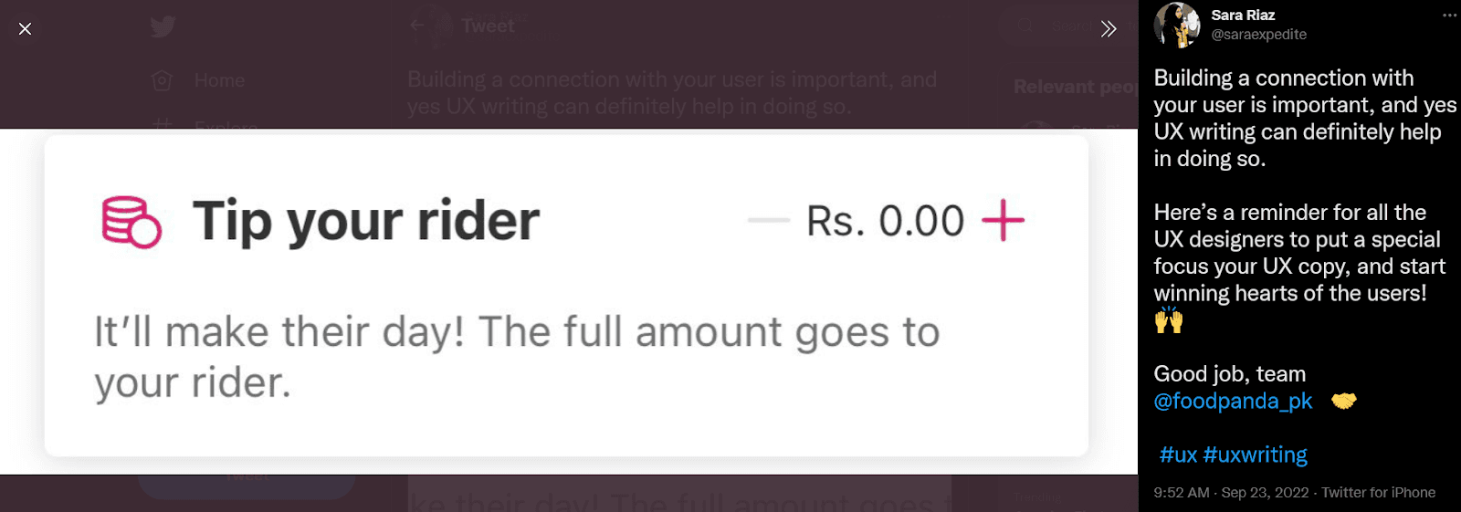 Outstanding UX writing is quickly recognized, and users appreciate it, like this public praise on Twitter for Foodpanda you can see below.