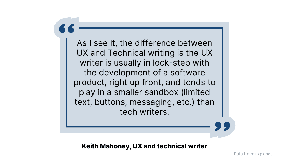 Here’s how Keith Mahoney, who has experience in both technical writing and UX writing, puts it: