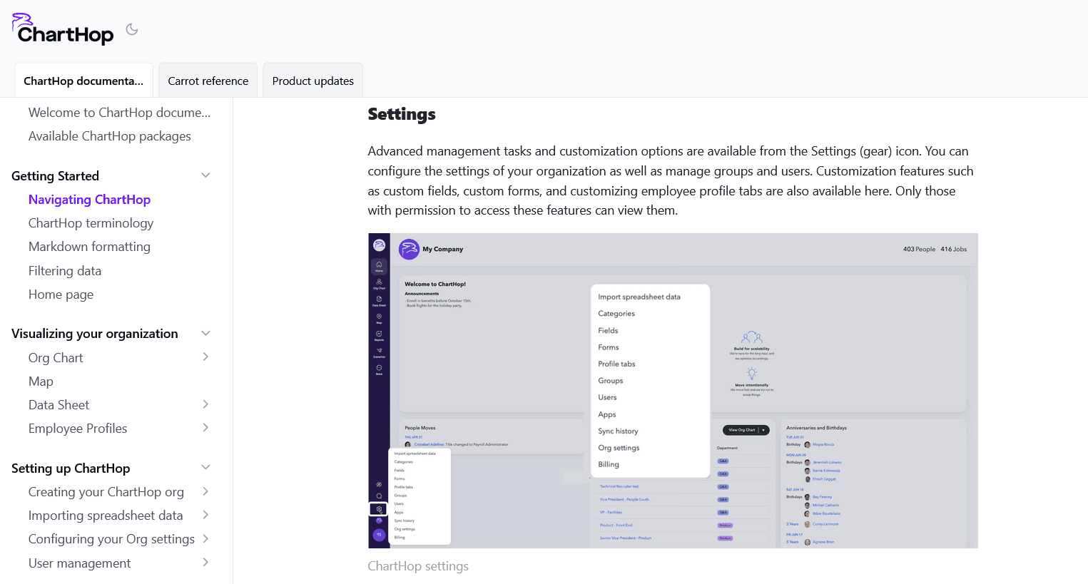 When a technical writer creates documentation like ChartHop’s, you can see again below, they do it for an audience with a certain level of technical knowledge.