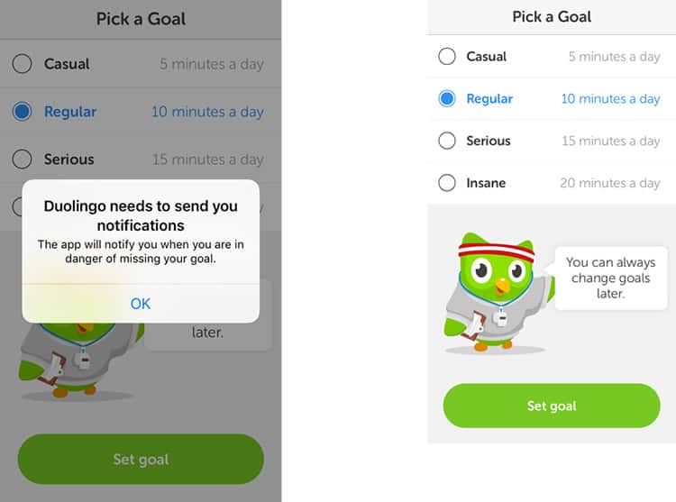 In the example above, Duolingo lets the user know that the notifications will actually help them in their language-learning process.