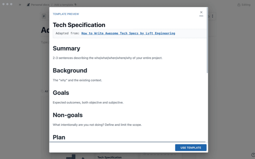 It offers templates for different types of technical documentation, like tech specifications, project proposals, monthly sales recaps, etc.