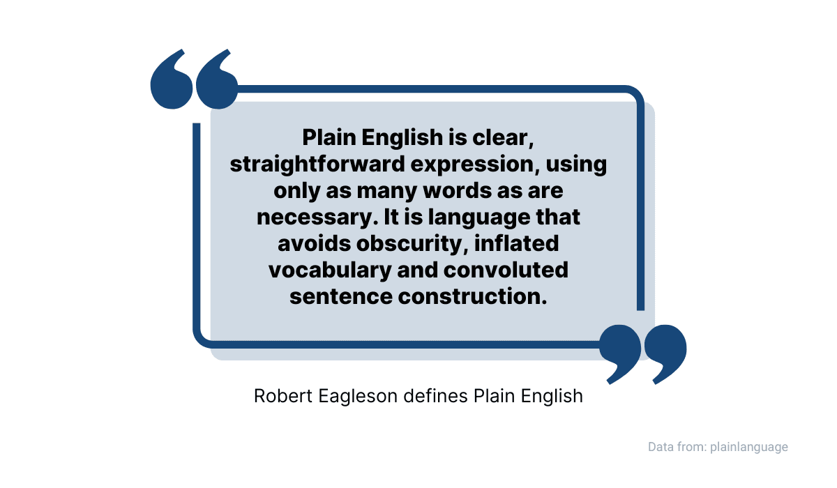 A language we just described has its own term—plain language. Here’s how the late Robert Eagleson, an English professor and a big proponent of plain language, defined it.