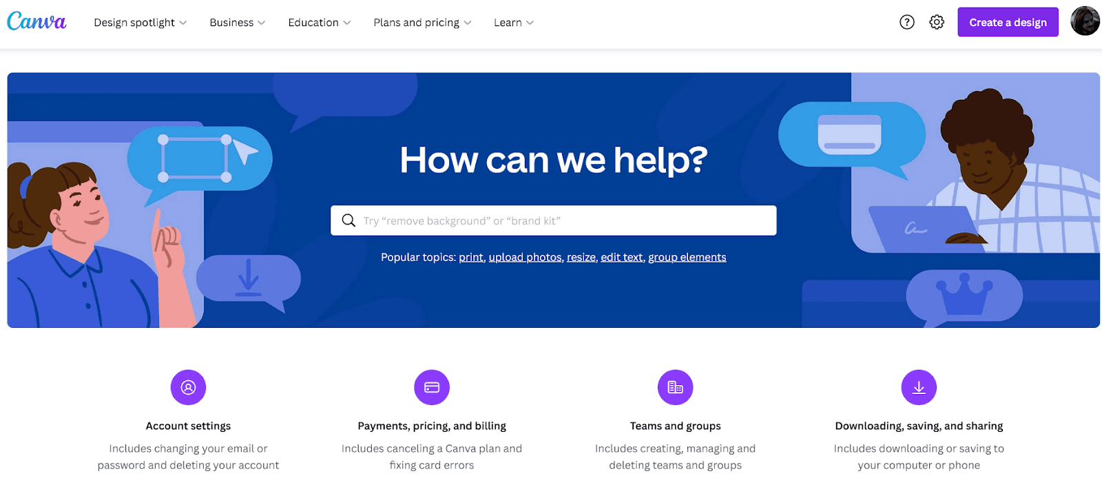 Canva, an online graphic design platform, has a rich help center that covers many topics and issues.