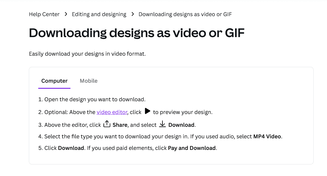 One of the articles provides instructions to users about how to download designs they make as videos or GIFs.