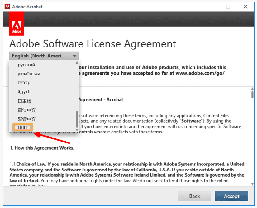 For example, take a look at Adobe’s Software License Agreement below. As you can see, there was a problem with the font in the drop-down menu.