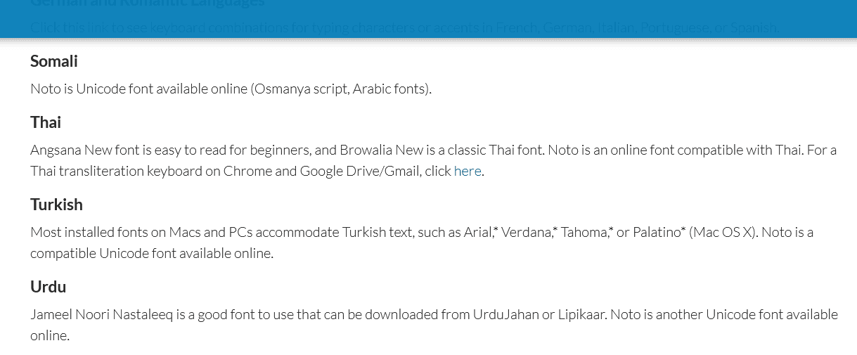 Of course, there are other ways to select an appropriate font. You can find helpful lists online which tell you what font to use for what language, like the one from Diplomatic Language Services.