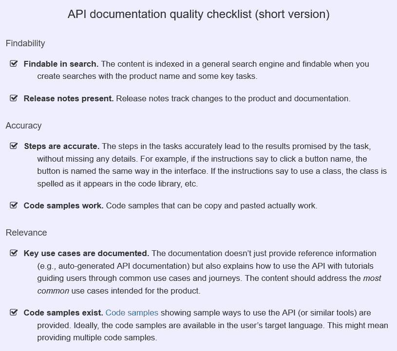 Tom Johnson, a technical writer and blogger, recommends using checklists like the one below.