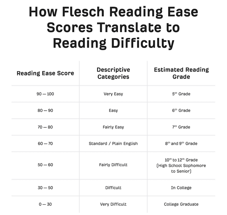 Also, the score is accompanied by the estimated reading grade. For example, if your text scores between 80 and 90, that means that the 6th grader could comprehend it.