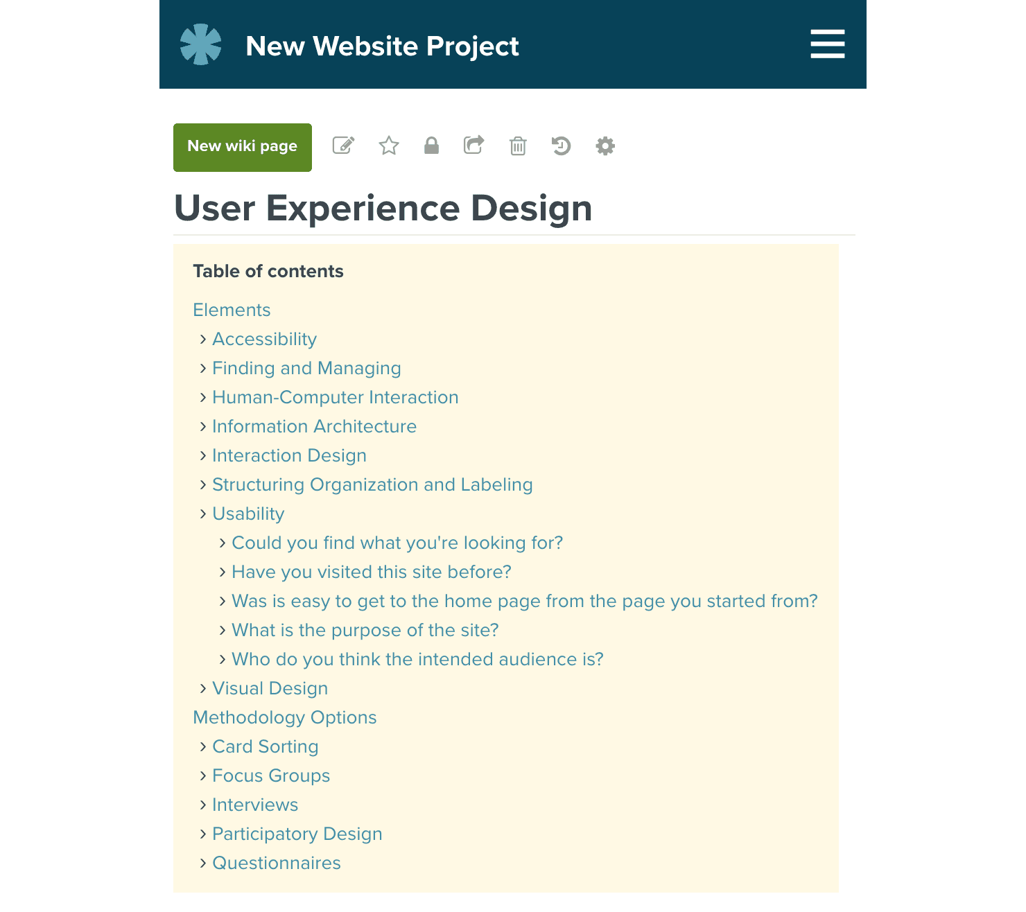 For instance, take a look at the table of contents from a wiki page about User Experience Design below.