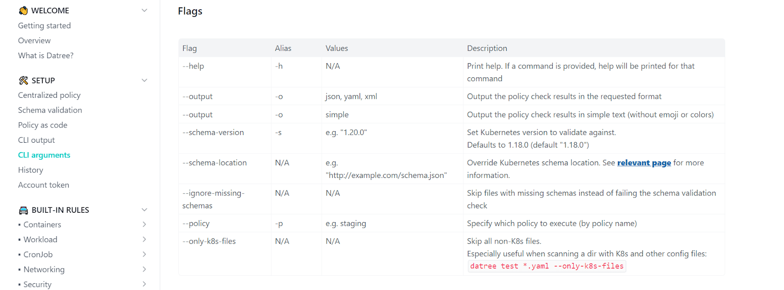 Instead, they offered a concise overview of the flags a user may get when using the Datree solution, together with their values and descriptions.