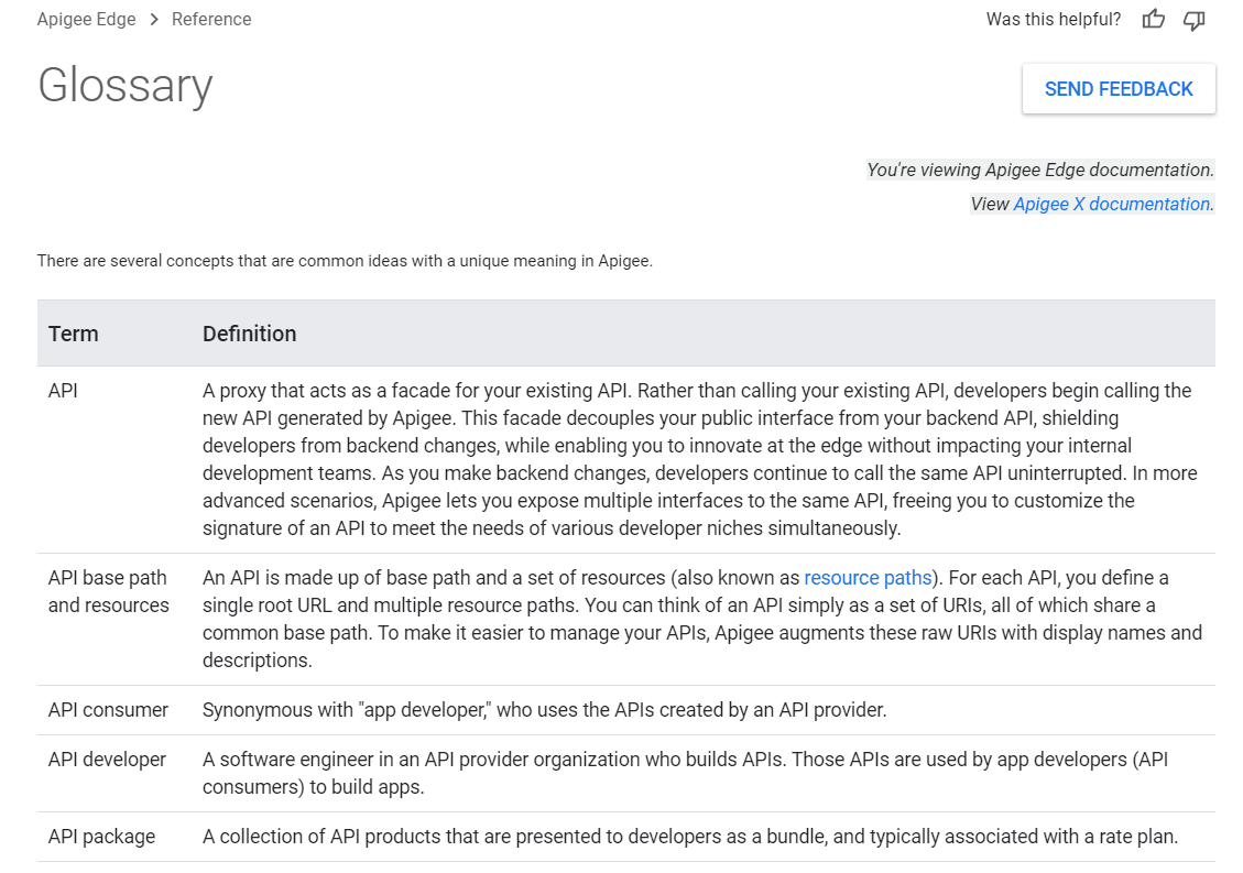 The image below shows the glossary of technical terms used in Apigee, an API management platform.