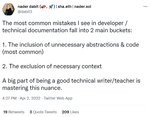 Nader Dabit, an author and a web and mobile developer, lists vague writing as the most common mistake in technical documentation.