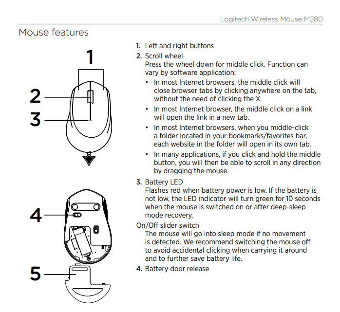 Rather than just listing the technical features of the mouse, the manual covers its crucial components, explains their functions, and provides concise instructions on how to use the product.