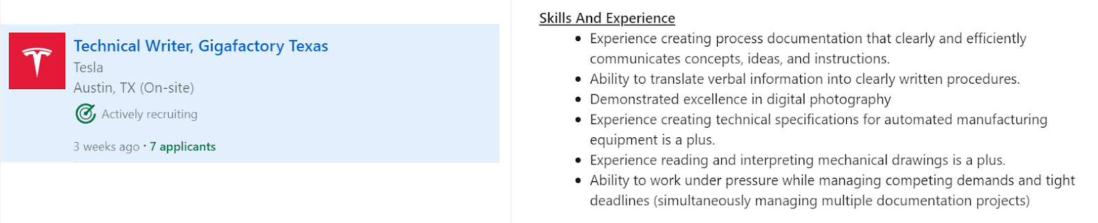 For instance, Tesla only requires tech writers to have industry experience.