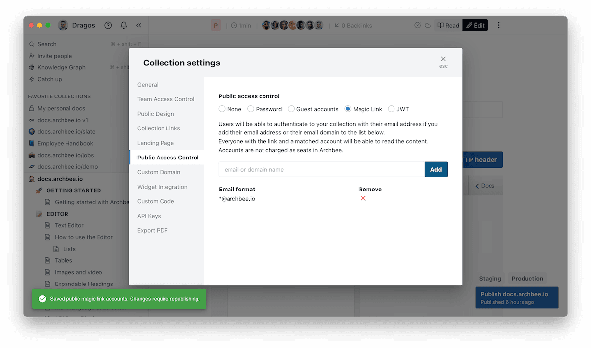 Archbee lets you customize the accessibility of each of your documents and it even has a magic link option to let you share individual documents and provide access with just an email address.