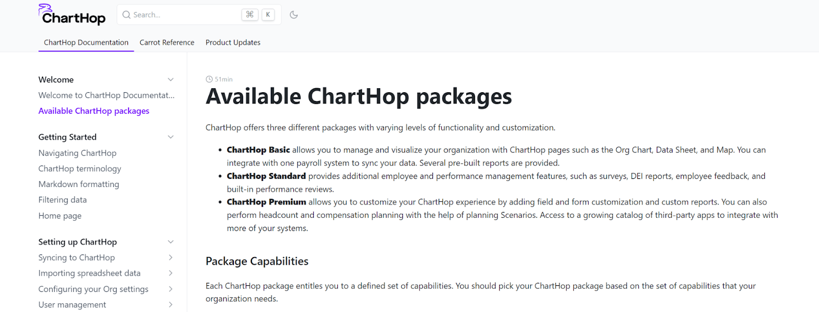 First up, here’s an article from ChartHop’s knowledge base that explains different product package options.