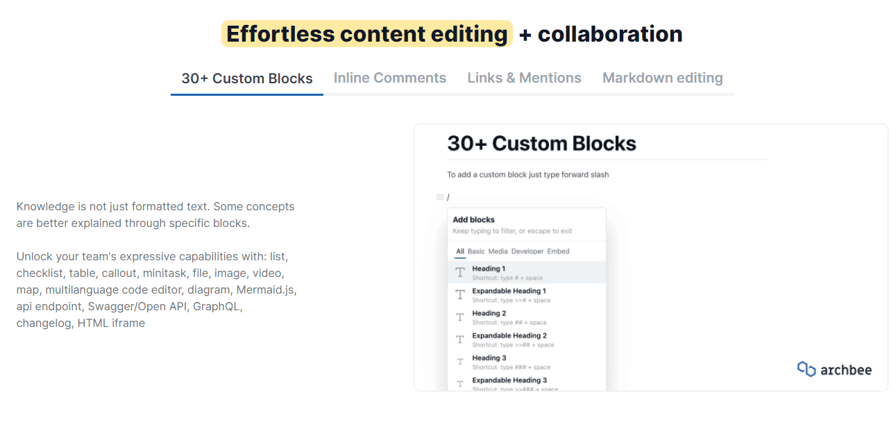 For example, if we wanted to create a bad user guide for Archbee’s customer blocks feature, we could just say: Archbee lets you add blocks like lists, checklists, API, and videos.