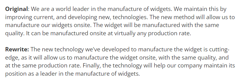 In the original content, the writer talked about the company and then moved on to a new method of manufacturing widgets.