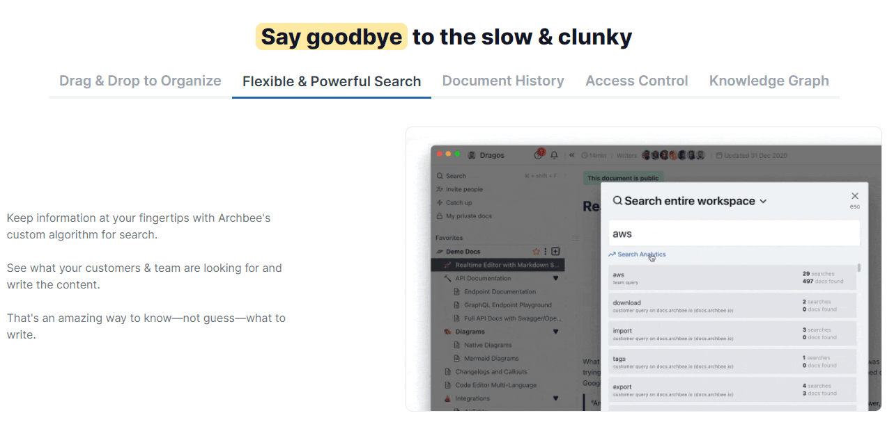 For example, we wanted to highlight the fantastic search analytics function of Archbee. On the left, we gave a short description of the feature.