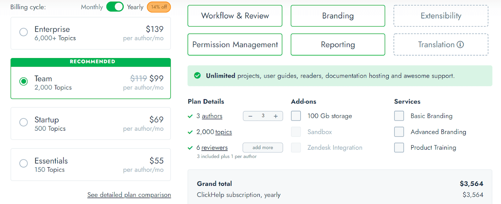The pricing depends on the exact size of the team. You can find a calculator on ClickHelp’s website and determine the price based on your needs.