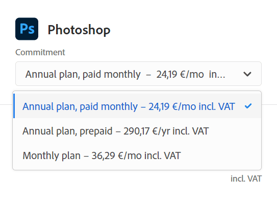 If you purchase Photoshop only, you’ll pay between €24.19 and €36.29 a month.