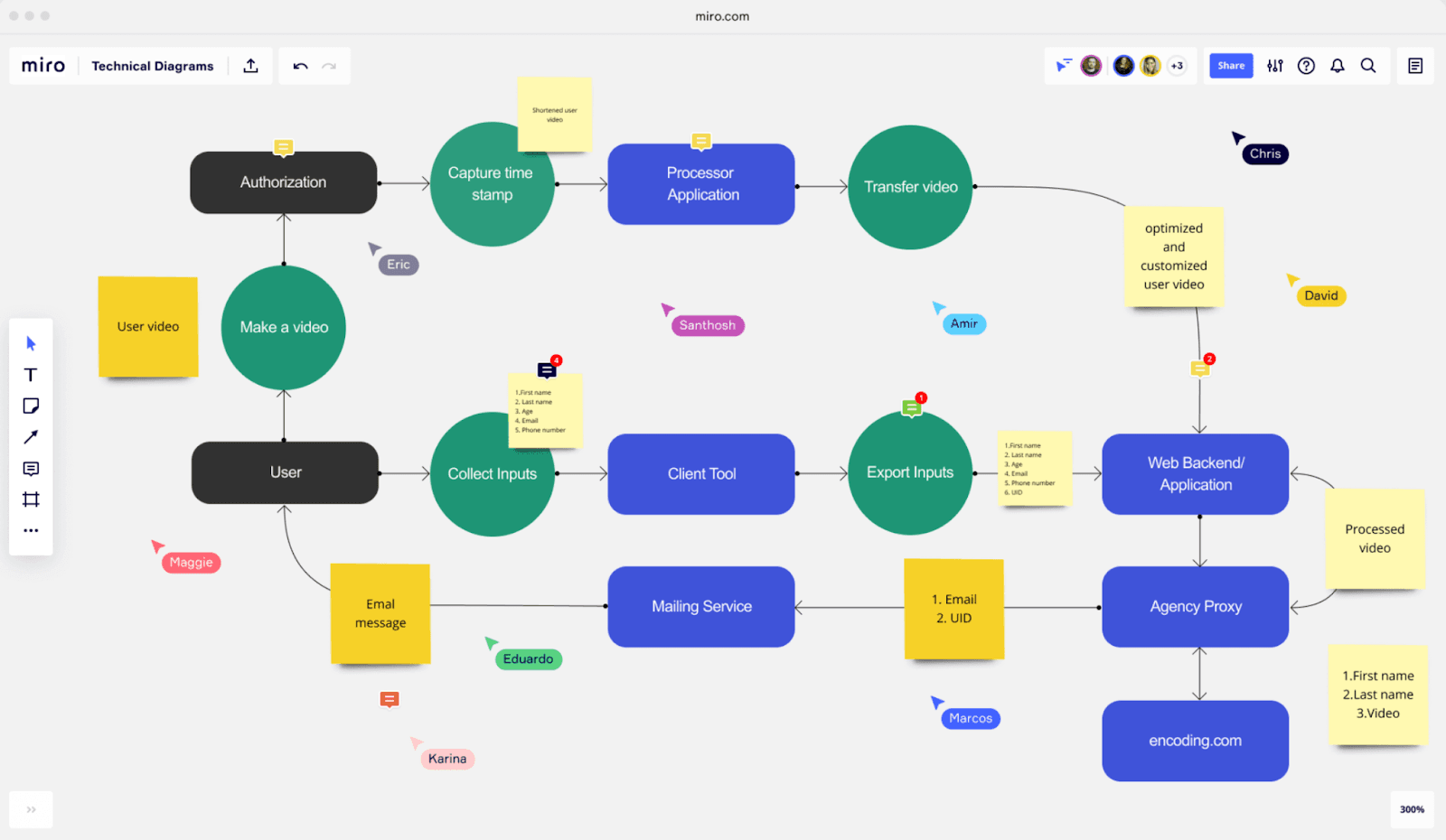 Diagrams are one of the best methods for showing the relationship between technical elements, and Miro is an excellent tool for that.