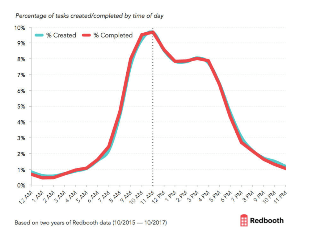 The graph you see above is the result of an analysis of hundreds of thousands of tasks created in Redbooth, a task management tool. It shows us that the greatest amount of tasks is completed by 11 am, after which productivity starts to fall, and finally plummets after about 4 pm.