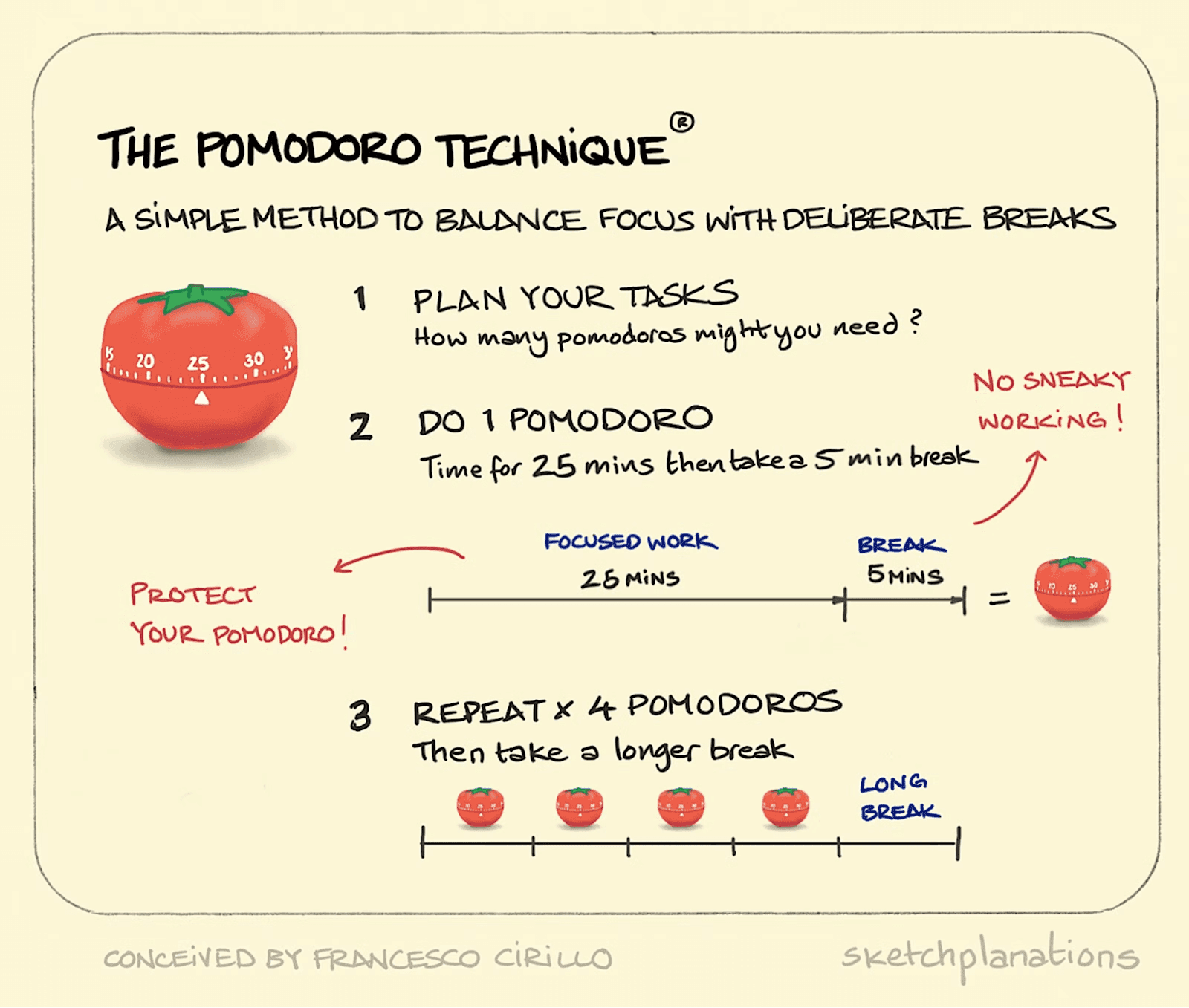 - Work in focus sprints with real breaks. Try Pomodoro (25/5) or the 52/17 rhythm—and step away from screens during breaks.