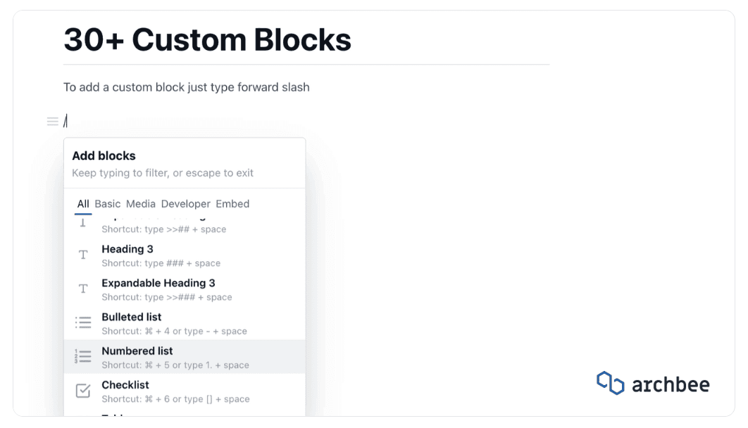 For example, Archbee has more than thirty custom blocks that will enable you to express yourself in every way you need to adequately transfer knowledge to your end-users.
