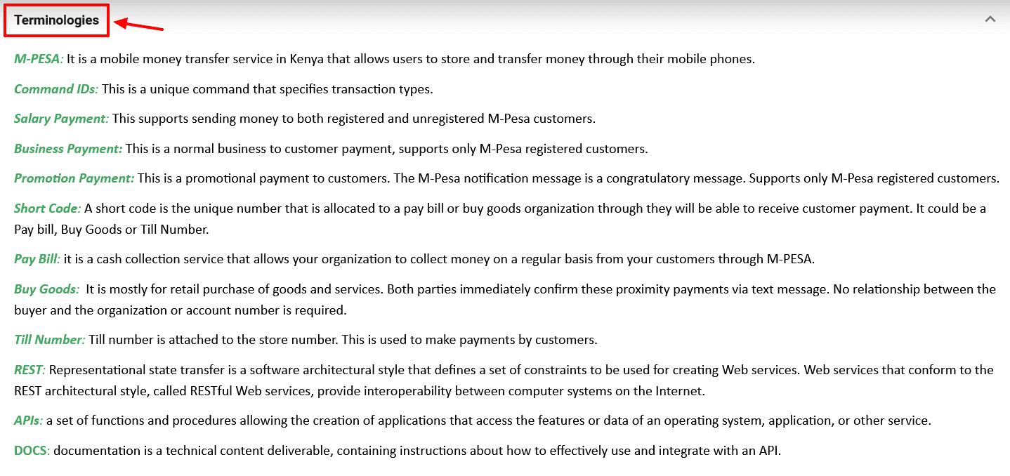 You can do that with a glossary of important terms, like the one from Daraja, a developer portal of mobile network operator Safaricom.