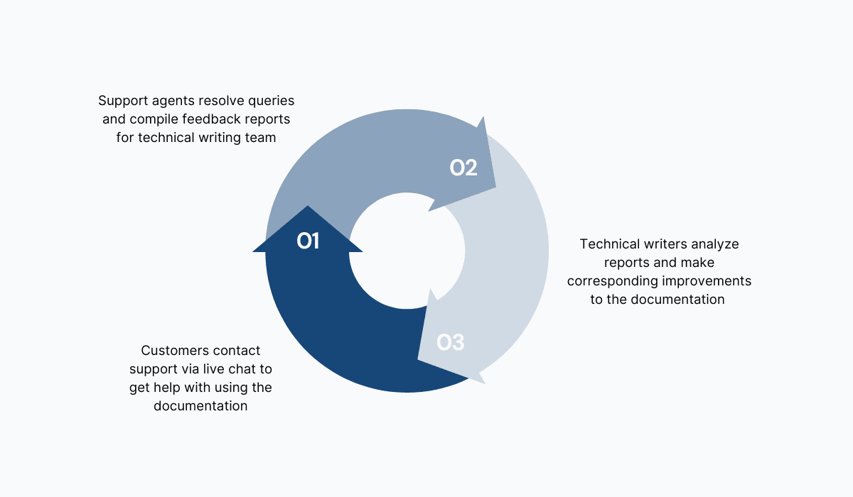 The customer support team could then compile reports on the problems users are facing when exploring the documentation and forward them to the documentation team, who would make the necessary changes.