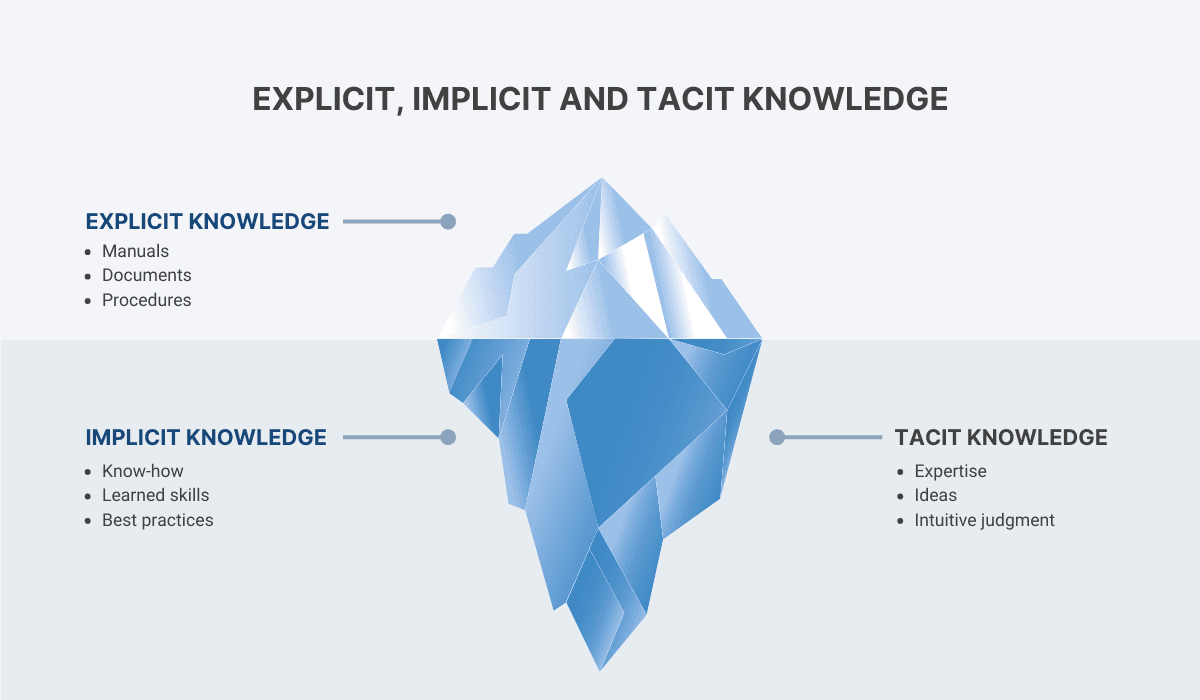 Implicit knowledge is more difficult to define and communicate, but it can be just as important as explicit knowledge. This type of knowledge essentially includes know-how, learned skills, and best practices.