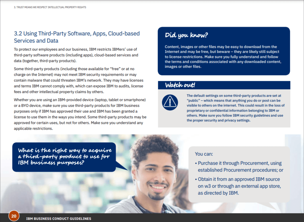 This type of knowledge includes things like product specifications, manuals, and processes, but also policies, regulations, and procedures, as you can see in the IBM Business Conduct Guidelines below.