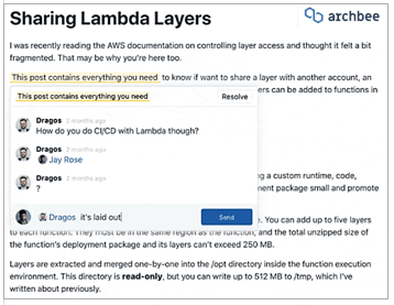 At the same time, Archbee allows them to regularly communicate, collaborate, and receive feedback from SMEs and all other relevant stakeholders, for instance, by making inline comments.