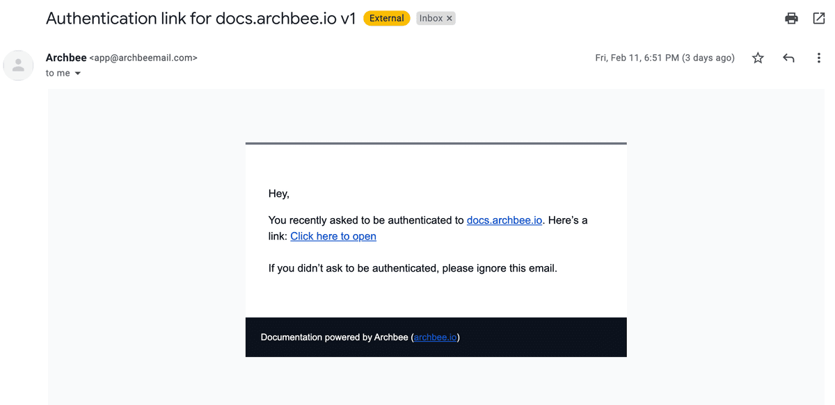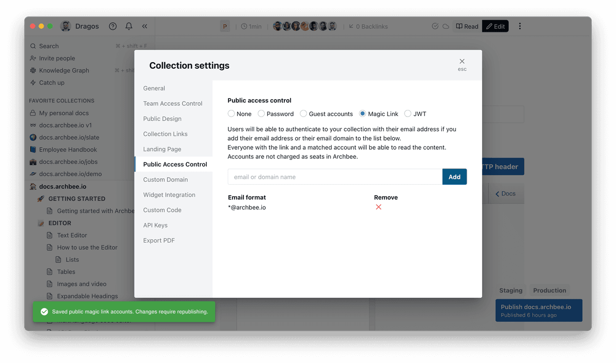 With Archbee, you can enter customers’ email or domain addresses. The platform then sends them the magic link to the knowledge platform.