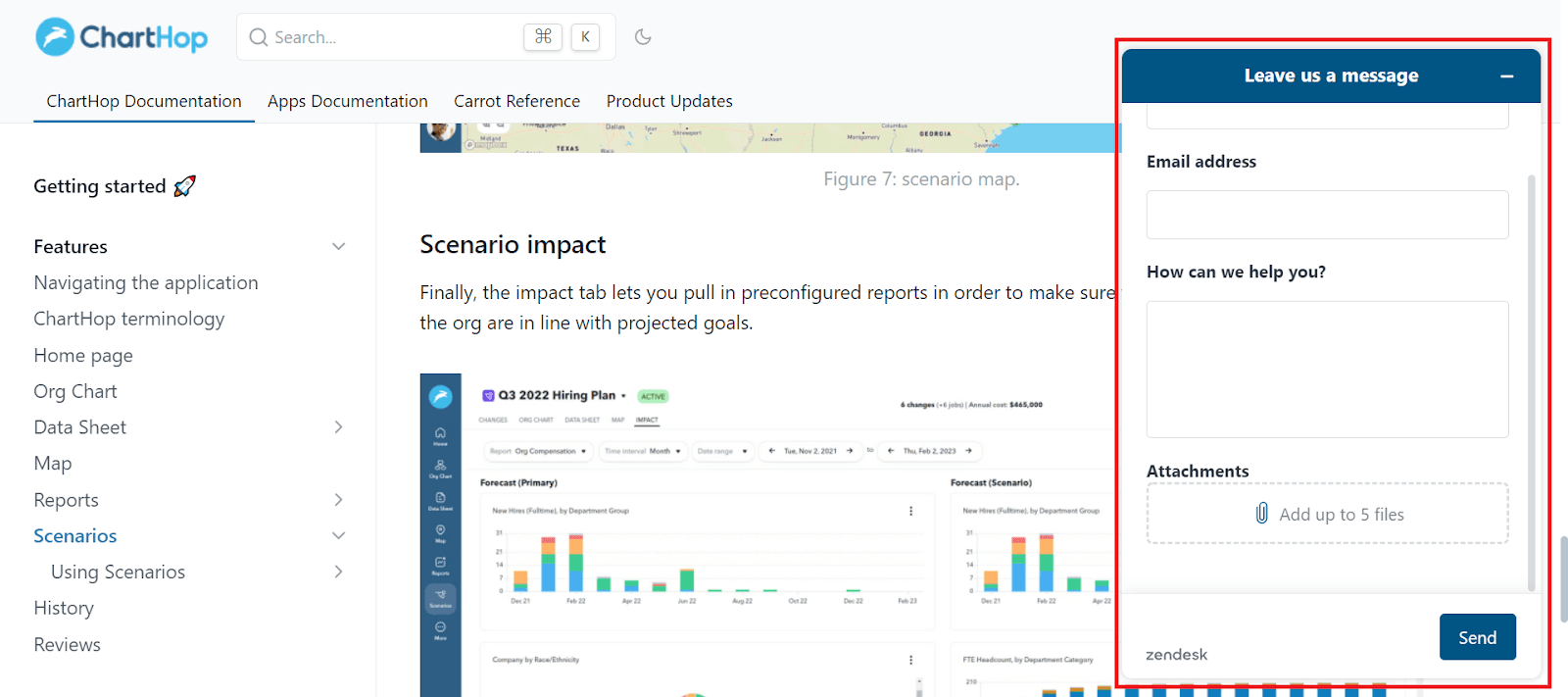 For instance, we could implement a Zendesk support form into your knowledge base, as we did with our client ChartHop.