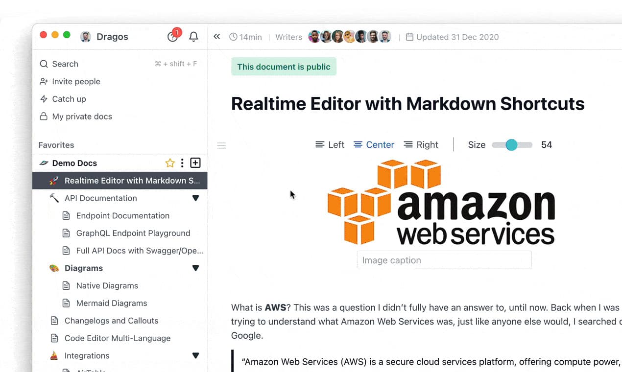 - Real‑time collaboration: Co-authoring, inline comments, mentions, and version history so teams can review and ship accurate docs faster.