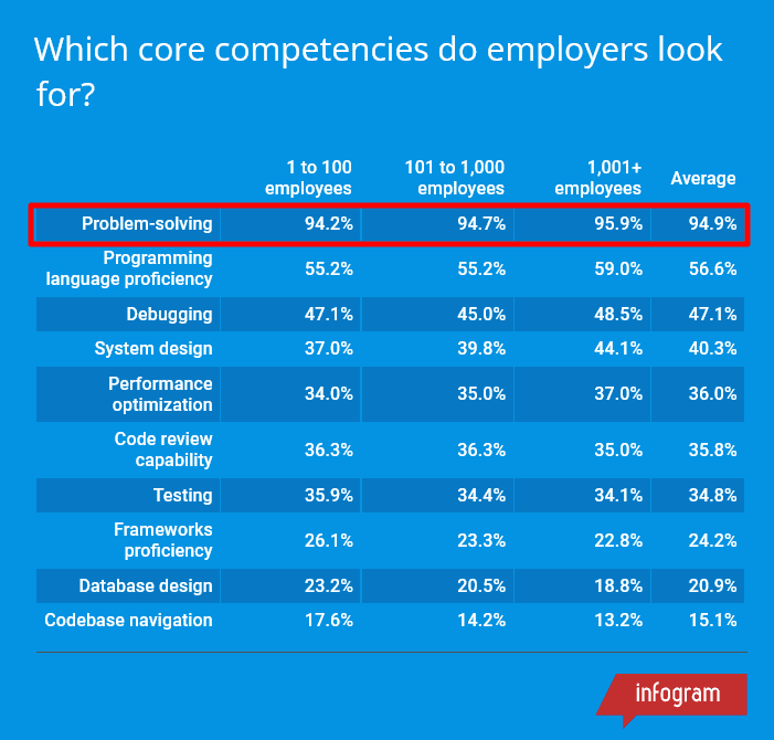 That’s why it’s not surprising that employers rate problem-solving skills very high when choosing the right developer to hire.