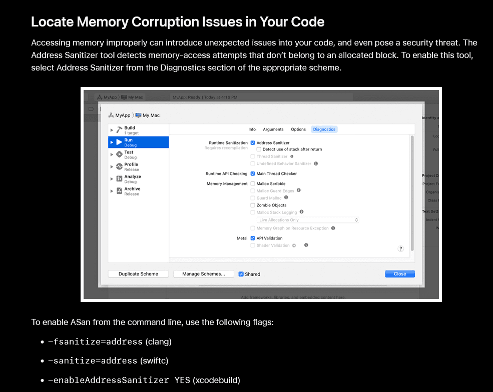 So, for instance, in the subsection about locating memory corruption issues in your code, they explain what tool to use, how to enable it, which flags to use from the command line, and how the tool works.